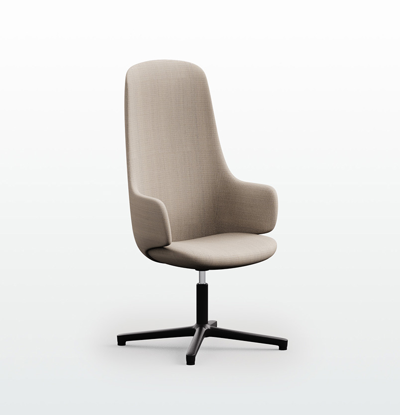 Fauteuil tapissé avec accoudoirs, piètement 5 roulettes et réglable en hauteur. Piètement 5 branches en aluminium poli à la bille ou peint, avec vérin à gaz pour le réglage de la hauteur. Roulettes au...