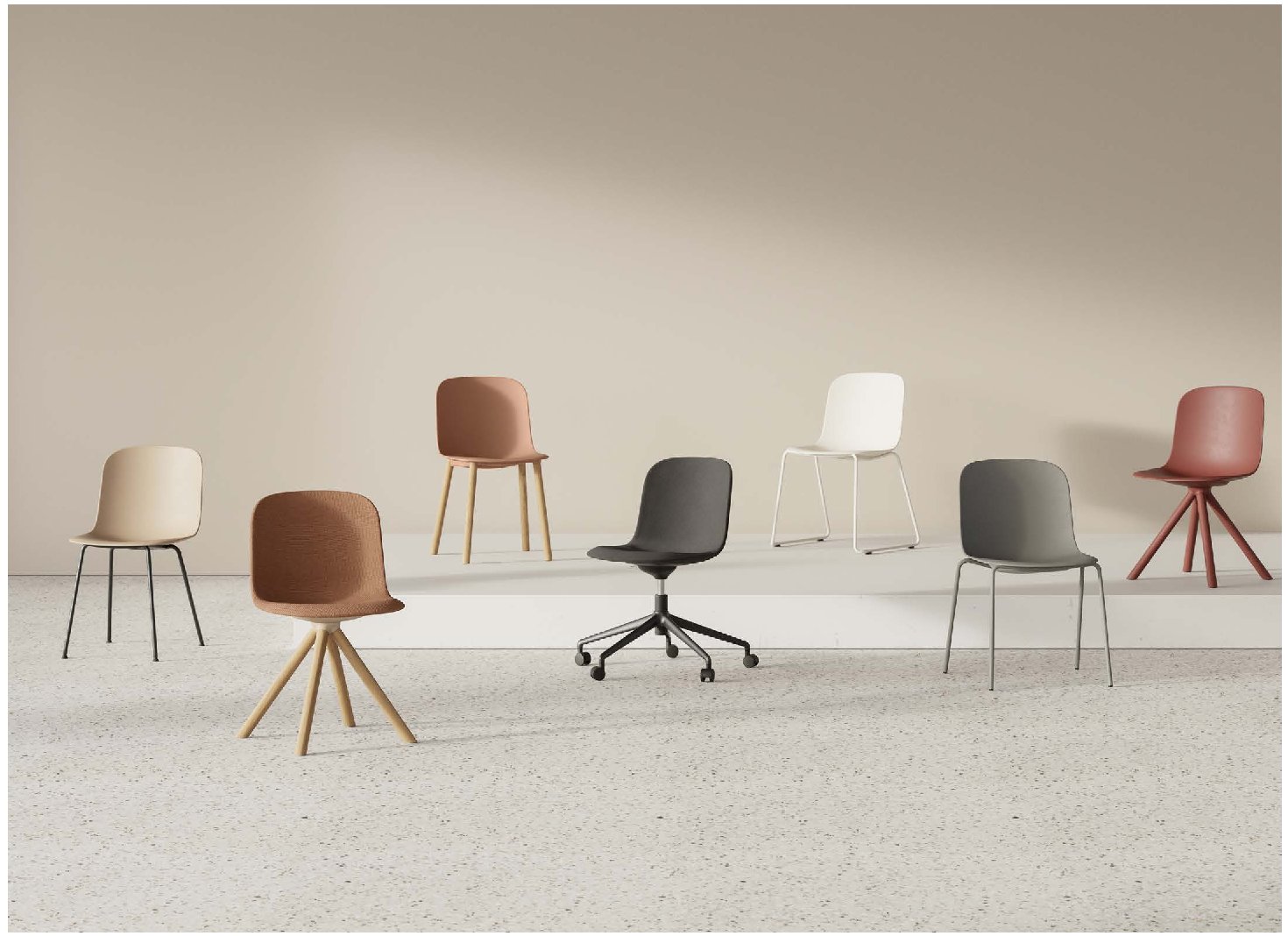 Chaise sans accoudoirs pivotante, base 4 branches en aluminium peint en poudre ou base en bois de chêne naturel ou vernis couleur noir.